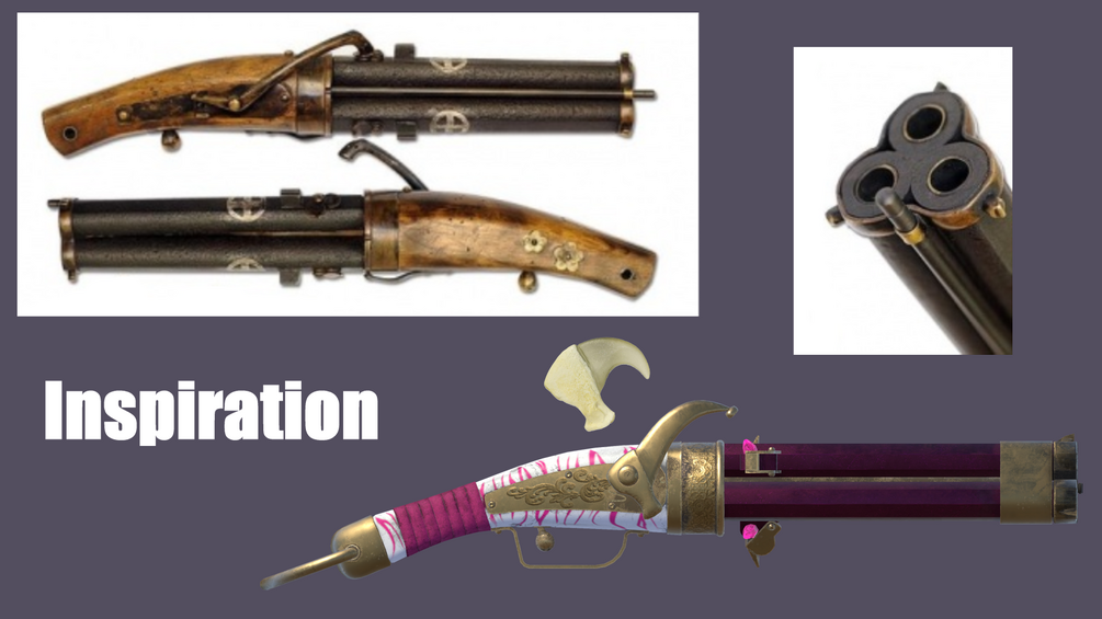 Design inspired by historical examples of Japanese Edo period matchlock pistols. The hammer is meant to resemble a tiger's claw!